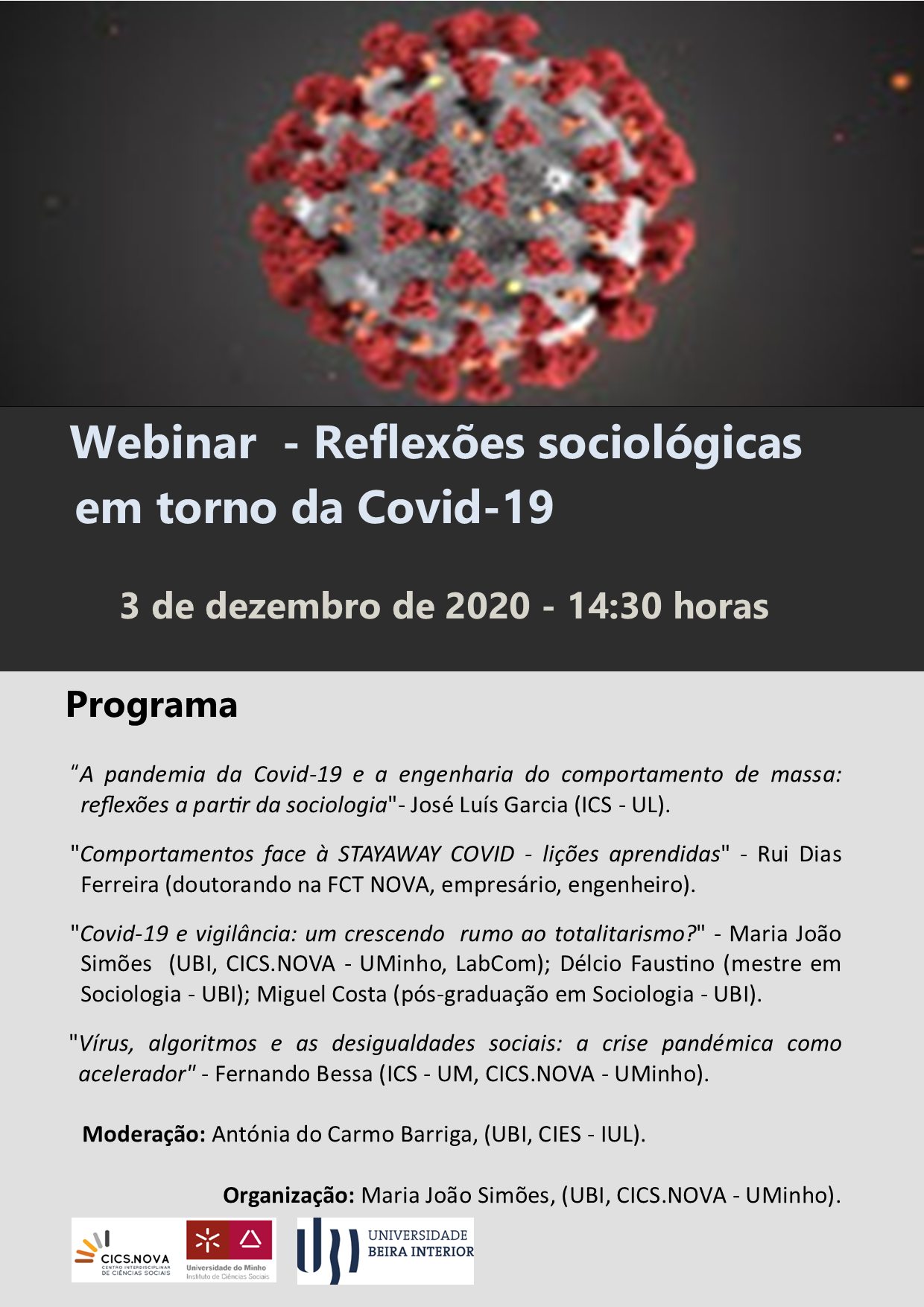 O Centro Interdisciplinar de Ciências Sociais da Universidade do Minho está a organizar o webinar “Reflexões sociológicas em torno da Covid-19” Este evento tem como objetivo estimular o debate em torno de questões sociológicas relevantes ligadas ao surto pandémico.