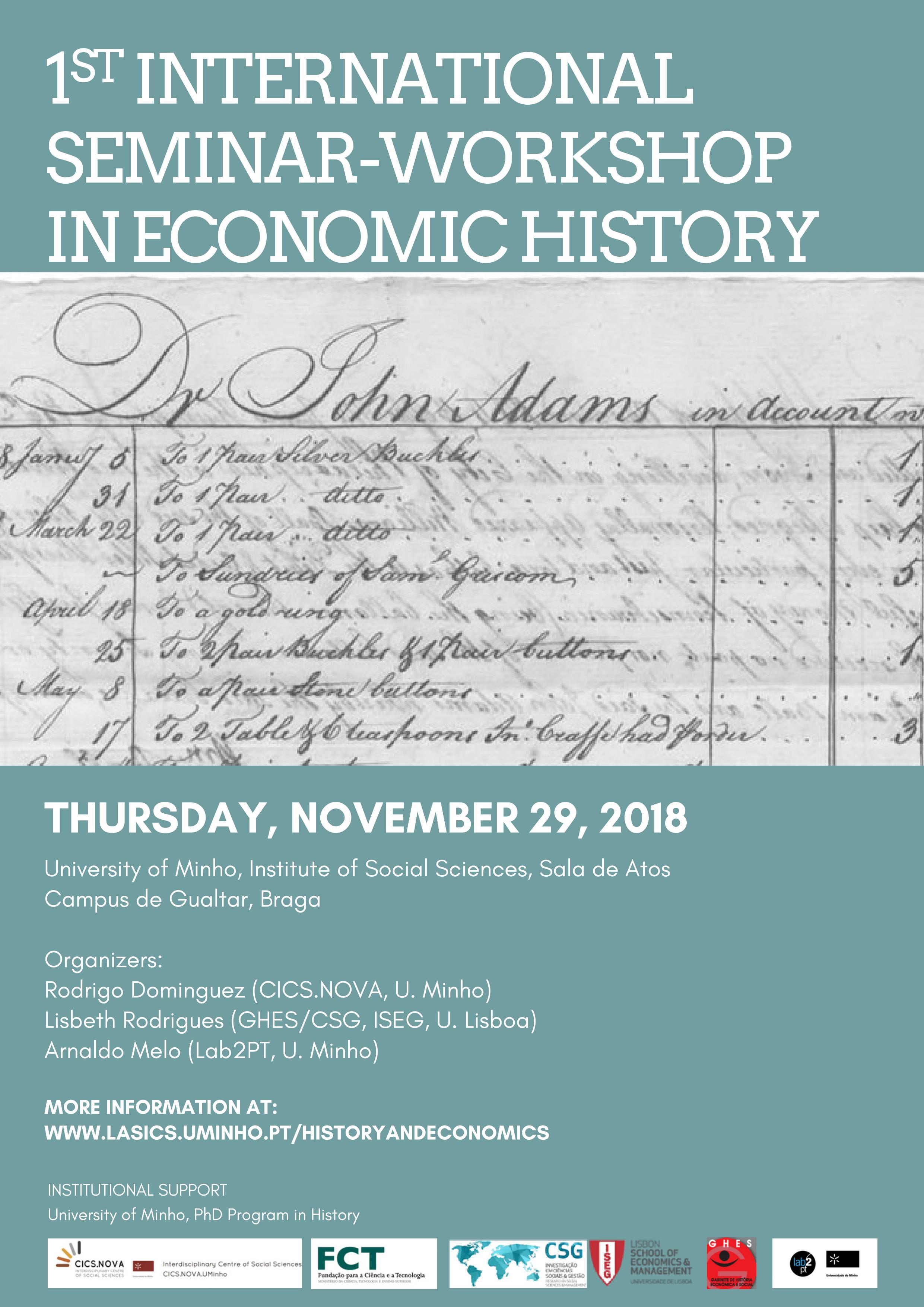O CICS.NOVA UMinho, o GHES/CSG, ISEG-ULisboa, o Lab2PT UMinho e o Curso de Doutoramento em História (UMinho) juntam-se na organização do I Seminário-Workshop Internacional em História Económica, a decorrer na Universidade do Minho, a 29 de novembro de 2018. Este evento pretende familiarizar os estudantes de graduação e pós-graduação em diferentes fontes, métodos e abordagens da História Económica. O Seminário-Workshop permitirá e incentivará a participação da audiência, no sentido de criar um ambiente dinâmico e crítico relativamente a temas, conteúdos e práticas de pesquisa em História e Economia.