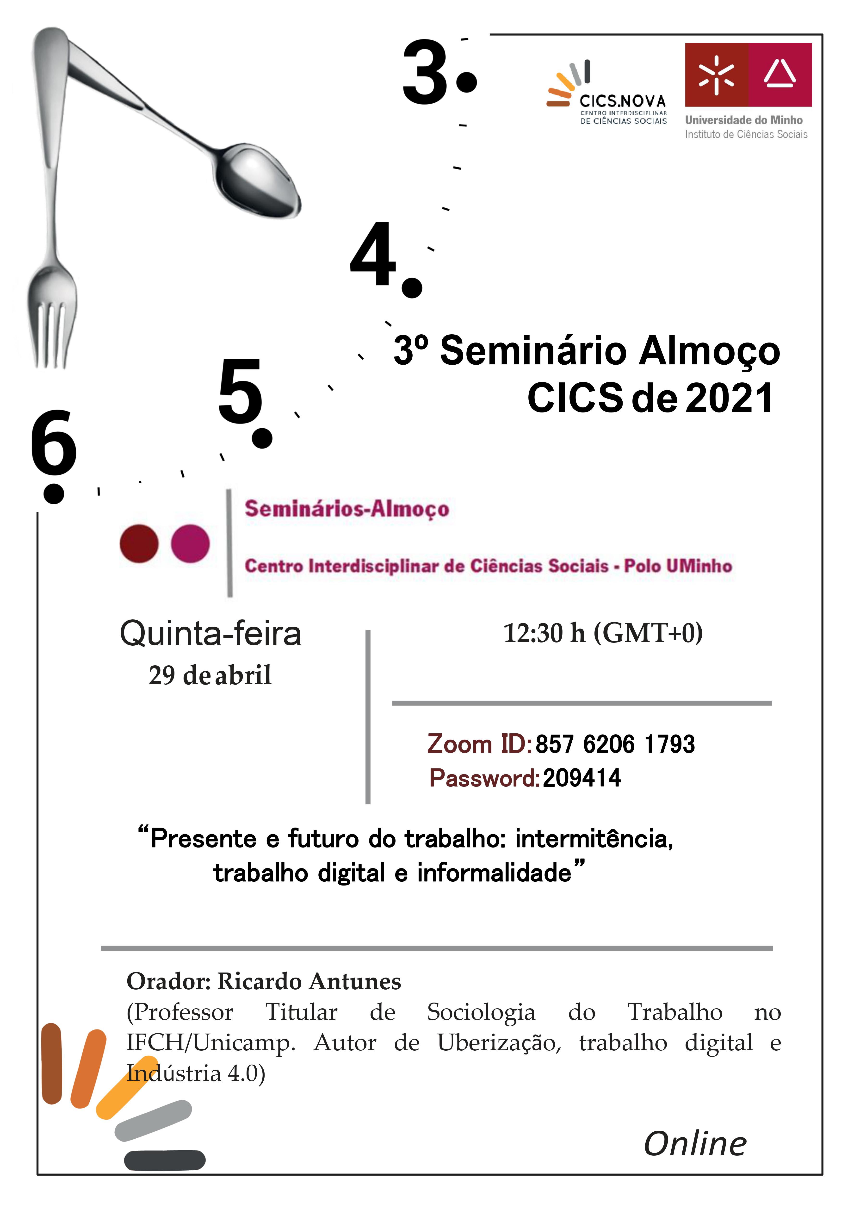 (English) Conferência “Presente e futuro do trabalho: intermitência, trabalho digital e informalidade” – Ricardo Antunes| 3º Seminário almoço CICS 2021| 29 de abril – 12:30 horas