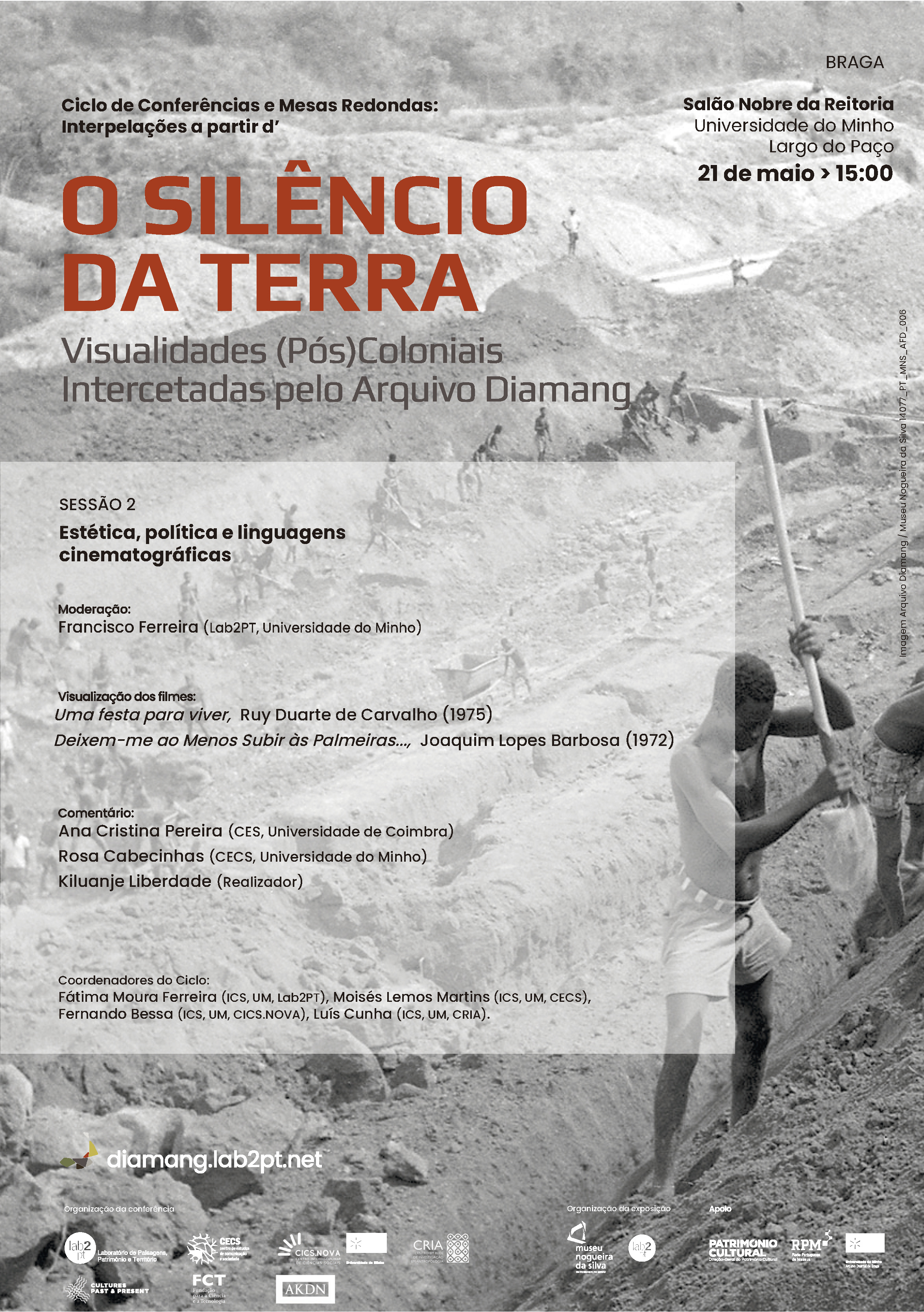 Terá lugar, no dia 21 de maio, pelas 15h00, a segunda sessão do Ciclo de Conferências e Mesas Redondas “Interpelações a partir d’ O Silêncio da Terra. Visualidades (pós)coloniais intercetadas pelo arquivo Diamang”. Com um formato híbrido (presencial e online), a sessão “Estética, política e linguagens cinematográficas I” contará com a participação de Ana Cristina Pereira (CES, Universidade de Coimbra, Rosa Cabecinhas (CECS, Universidade do Minho) e de Kiluanje Liberdade (realizador angolano), e com a moderação de Francisco Ferreira (Lab2PT, Universidade do Minho).
