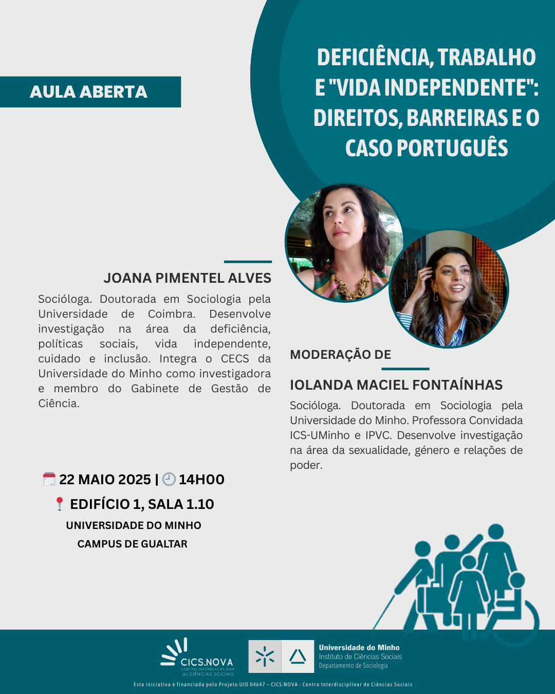 Temos o prazer de convidar a comunidade académica e o público em geral para a aula aberta com a investigadora Joana Pimentel Alves, dedicada à temática “Deficiência, Trabalho e “Vida Independente”: Direitos, Barreiras e o Caso Português“. A sessão contará com a moderação de Iolanda Maciel Fontaínhas e abordará os principais obstáculos enfrentados pelas pessoas com deficiência no acesso ao trabalho e ao exercício da autonomia, refletindo sobre o papel das políticas públicas e sociais no contexto português.