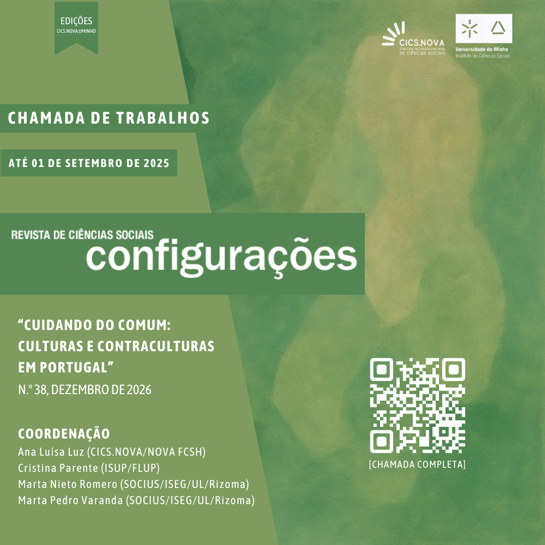 CHAMADA DE ARTIGOS Configurações: Revista de Ciências Sociais N.º 38 – Dezembro de 2026 Cuidando do comum: culturas e contraculturas em Portugal Coordenação do Dossiê: Ana Luísa Luz (Centro Interdisciplinar de Ciências Sociais da Universidade Nova de Lisboa, ORCID ID 0000-0002-4276-1938), Cristina Parente (Instituto de Sociologia da Universidade do Porto, Departamento de Sociologia da Faculdade de Letras da Universidade do Porto, ORCID ID 0000-0002-7500-7050), Marta Nieto Romero (SOCIUS/ISEG/Universidade de Lisboa e Malha Cooperativa/RIZOMA, ORCID ID 0000-0001-8247-9569), Marta Pedro Varanda (SOCIUS/ISEG/Universidade de Lisboa e Malha Cooperativa/RIZOMA, ORCID ID 0000-0002-9762-2724) |